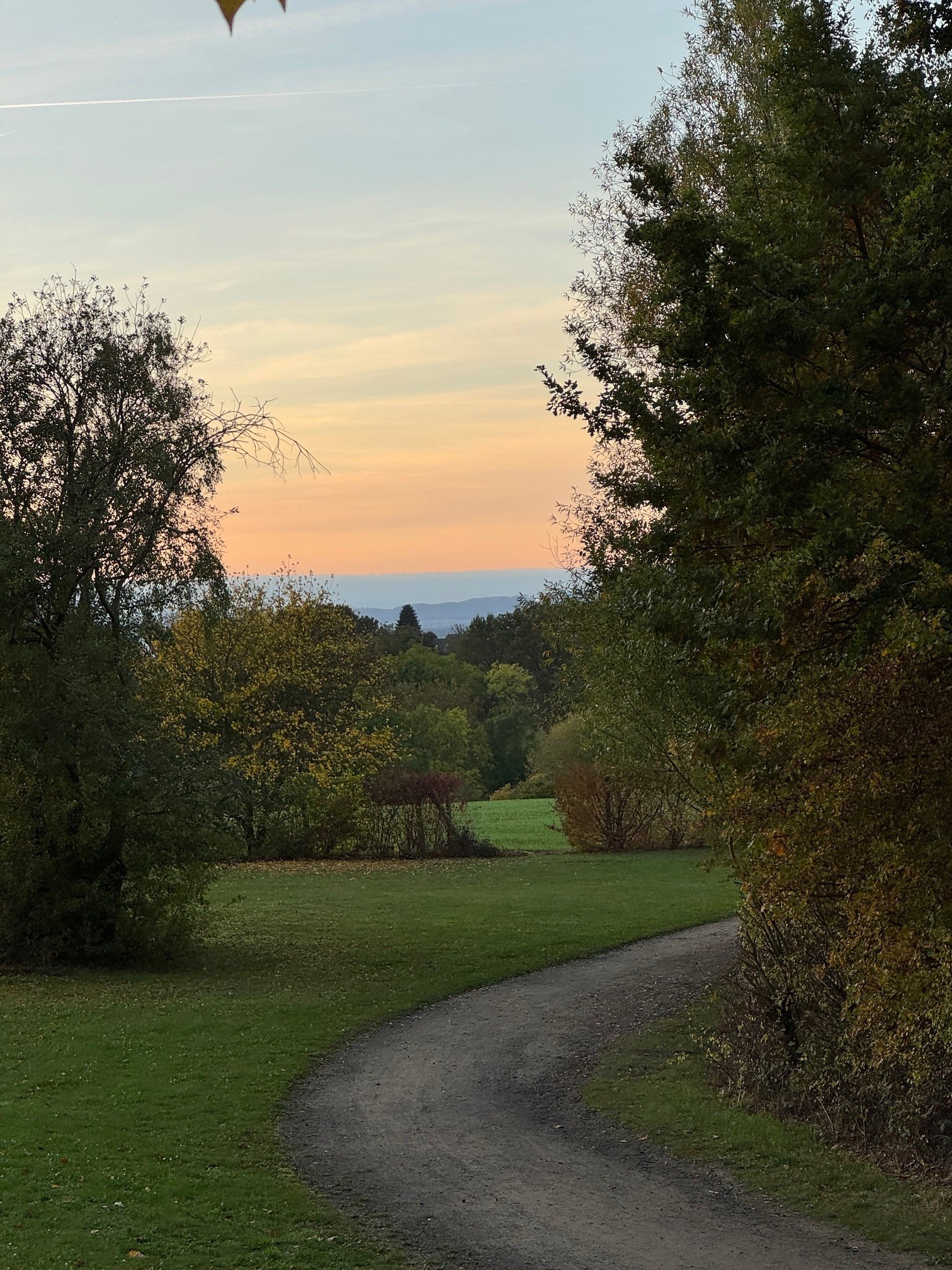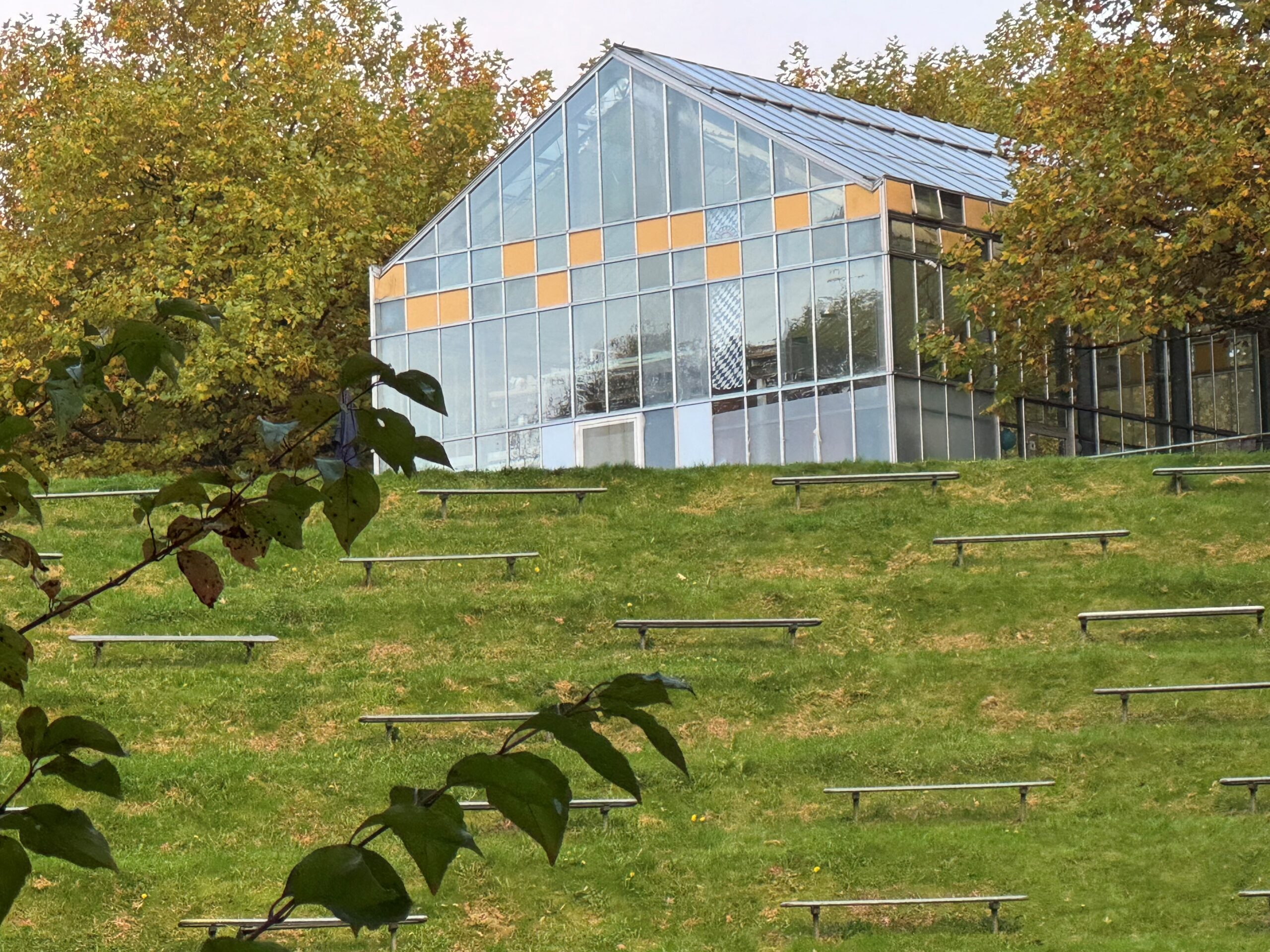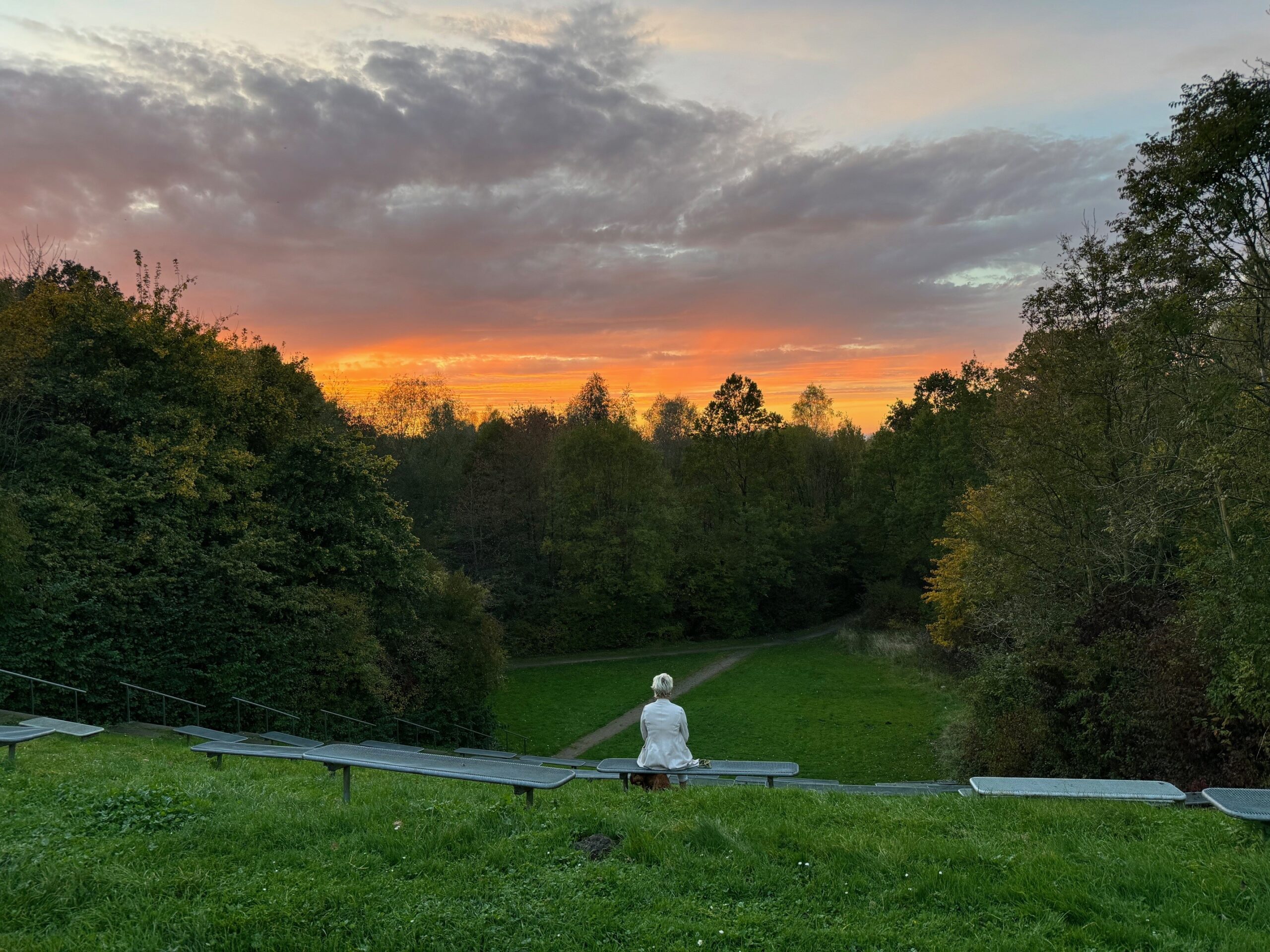 Der Geländesprung zu diesem einzigartigen Naturraum ist zu einer Freilichtbühne geformt worden. Hier können sich Besucher ausruhen und den Blick über die Landschaft schweifen lassen. Am Horizont zeigen sich die Erhebungen des Wiehengebirges.